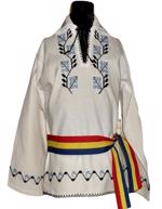 camasa baietei traditional romaneasca din panza de bumbac brodata manual cu motive florale rosu si negru, cu guler normal, siret la gat si maneca larga.