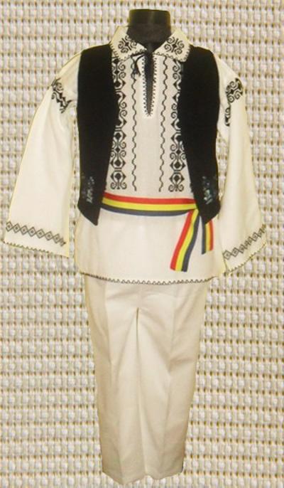 camasa baietei traditional romaneasca din panza de bumbac brodata manual cu motive populare negru, cu guler normal , siret la gat si maneca larga, pantaloni albi din doc, brau tesut tricolor si vesta din stofa neagra cusuta cu motive vlorale albastru, rosu si galben.