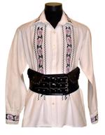 Camasa barbati traditional romaneasca din panza de bumbac brodata manual cu motive florale cu lila si negru, cu guler tunica,siret la gat si maneca larga