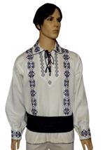 Camasa din panza de bumbac gros ( matador) alba, cusuta manual cu fir albastru si negru.