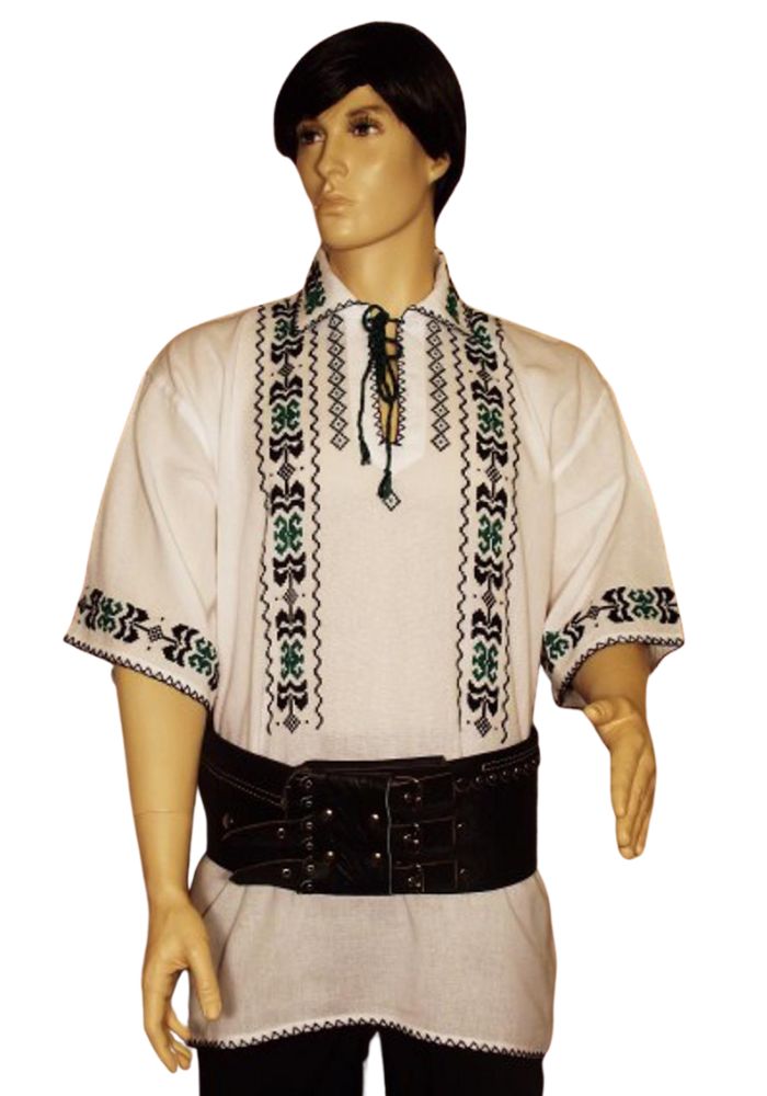 Această cămașă populară tradițională pentru bărbați este realizată din pânză albă de bumbac de înaltă calitate, cusută manual cu mare atenție la detalii. Modelul cusut manual pe această cămașă prezintă motive traditionale cu rosu si negru, creând un design deosebit și unic.