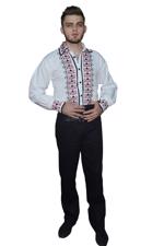 Această cămașă tradițională pentru bărbați este confecționată dintr-o pânză albă de bumbac de înaltă calitate, cusută manual cu mare atenție la detalii. Gulerul și închiderea cu nasturi albi pe piept adaugă o notă de eleganță și stil acestei piese vestimentare. Mâneca cu mansetă completează perfect designul cămășii, oferind un aspect elegant și sofisticat. Modelul cusut manual pe această cămașă prezintă motive tradiționale de culoare roșie și neagră, cusute pe guler, piept și mansetă, iar dantela alba ofera o notă autentică și personala piesei vestimentare.