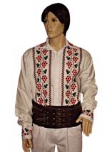 Camasa populara barbati din panza groasa de bumbac (vezi foto in tabel de masuri) brodata manual cu model traditional cu rosu si verde, cu guler normal si maneca lunga cu manseta si insertie de dantela alba la guler, maneci si pe langa nasturi. Braul din imagine este cu titlu informativ, nu este inclus in pretul camasii.