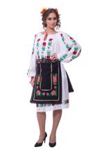 Acest costum popular de femei banatean este compus dintr-o ie traditionala romaneasca din panza de bumbac , brodata manual cu motive populare cu fir albastru si galben, cu maneca lunga ce se termina cu o manseta. Poalele (fusta) sunt albe, din panza de bumbac cu doua insertii de dantela alba pe margini. De asemenea, costumul include doua catrinte (fote) de 100 cm lungime, fata-spate, din stofa albastra brodate cu motive florale, un brau si o vesta din stofa cu broderii florale.
