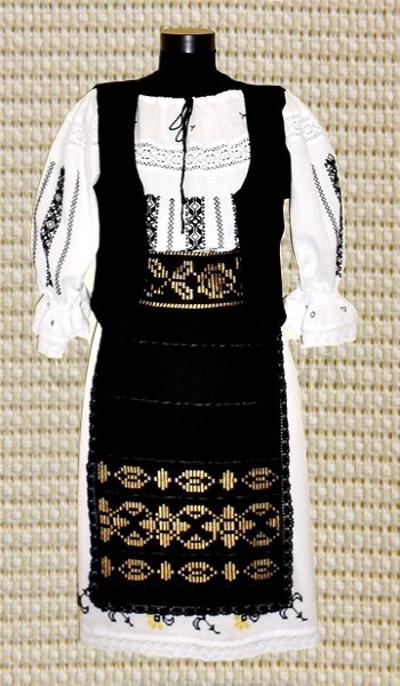 ie traditional romaneasca din panza de bumbac brodata manual cu motive geometrice galben si negru cu maneca ¾ , cu insertie de dantela alba pe piept de jur imprejur si la maneca cu elastic, poale(fusta) alba din panza de bumbac cu insertie de dantela alba pe margini,brodata manual pe poale cu acelasi model de pe ie, 2 catrinte(fote) de 50 cm lungime , fata-spate, tesute in razboi din lana neagra si motive populare cu matase galbena , iar de jur imprejur insertie de dantela neagra , brau din acelasi material si vesta din stofa neagra lana 100% cu insertie de dantela neagra pe margini.