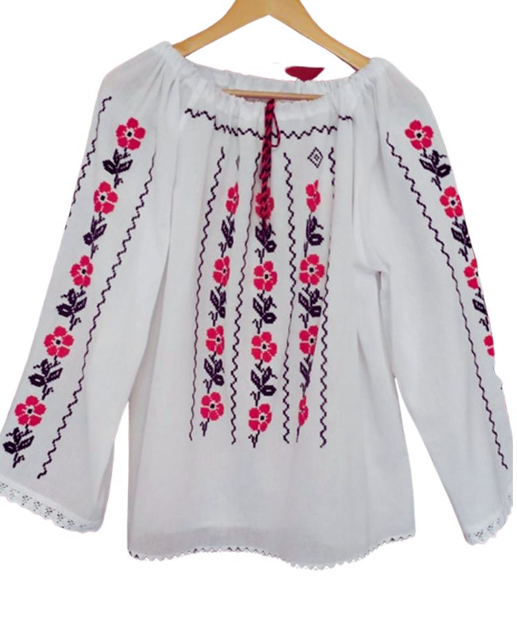 Camasa populara de femei din panza alba de bumbac cusuta manual cu motive traditionale romanesti cu rosu si negru, maneca 3/4 cu insertie de dantela alba din bumbac pe margini.